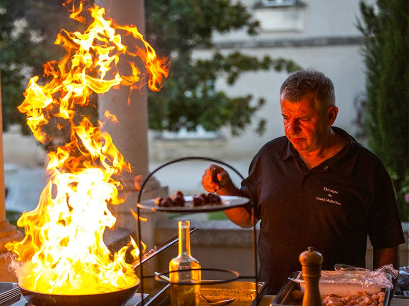 Au Grand Malherbes, la cuisine n'est pas qu'une prestation, c'est une signature. Vincent dirige personnellement les cuisines avec l'exigence qui le caractérise, tout en maintenant un contact rapproché avec chaque client pour concevoir ensemble les menus, définir le style souhaité, et orchestrer le déroulement de chaque journée. L'objectif : personnaliser sans jamais être figé par des formules toutes faites.